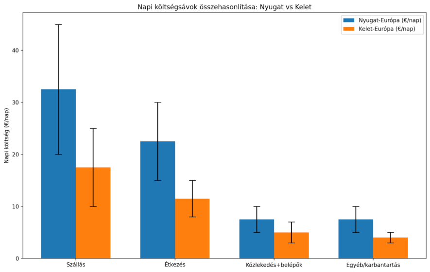 A számok mellett sokat segít egy gyors vizuális összehasonlítás is — ezért az alábbi grafikonon kategóriánként látható a napi költségek sávja Nyugat- és Kelet-Európában.