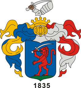 A címer: zöld alapú, kék kerek talpú pajzs, mezejében vörös nyelvet öltő, földön jobbra forduló oroszlán, a jobbján kivont karddal. A sisak szembenéző arany, ötlevelű koronával sisakdísze páncélos, könyöklő kar karddal. Oldalt pajzstakarók, arany, ezüst, kék, illetve vörös színben.