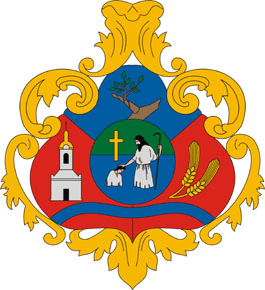 Álló, három részre vágott, csücskös talpú pajzs, melynek közepén egy belső, kerek pajzs található. Ezen belső pajzson egy vízben álló és egy vízben térdelő alak helyezkedik el, a háttérben egy kereszt. A három részre vágott külső pajzs felső részében (kék alapszínnel) egy kiszáradt fatörzsből új hajtás nyílik, a bal részben (arany alapszínű) egy gabonakalász található, míg a jobb részben (piros alapszínű) egy templom áll. A pajzs alján kék habos pólya fut végig.