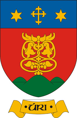 Álló, háromszögű pajzs vörös mezejében kék pajzsfő. A kék mezőben középütt lebegő helyzetű liliomvégű arany latin kereszt, melyet két oldalról egy-egy hatágú aranycsillag kísér. A vörös mezőben zöld hármashalom középsőjén nyugvó, a honfoglalás korát idéző, áttört arany palmetta motívum. A címerpajzs alatt lebegő hármas tagolású íves aranyszalagon feketével nagybetűs ÚRI felirat. A településnév előtt és után egy-egy díszpont.